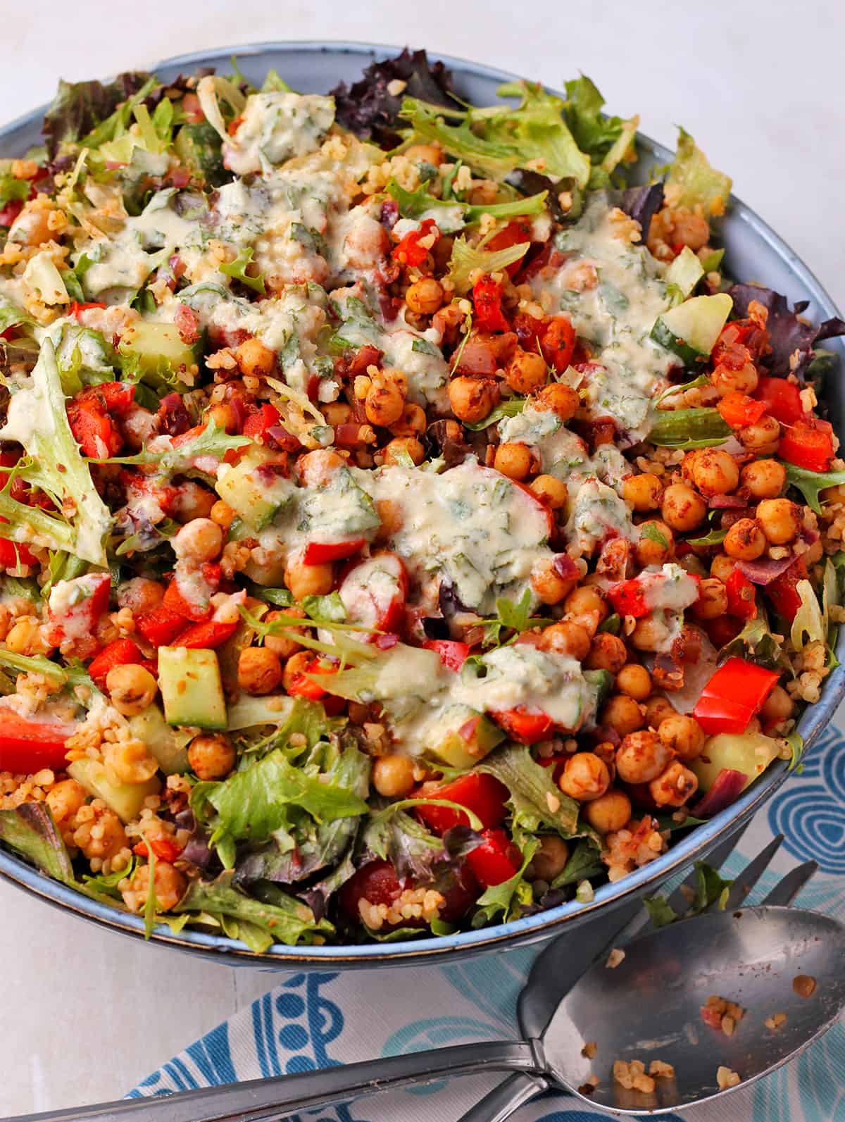 Tabbouleh is a type of bulgur salad with fresh herbs, chopped vegetables, and a lemon-based dressing. This bulgur wheat salad recipe is heartier, with chickpeas, veggies, lettuce, and creamy tahini dressing so it’s more of a main than a side.
