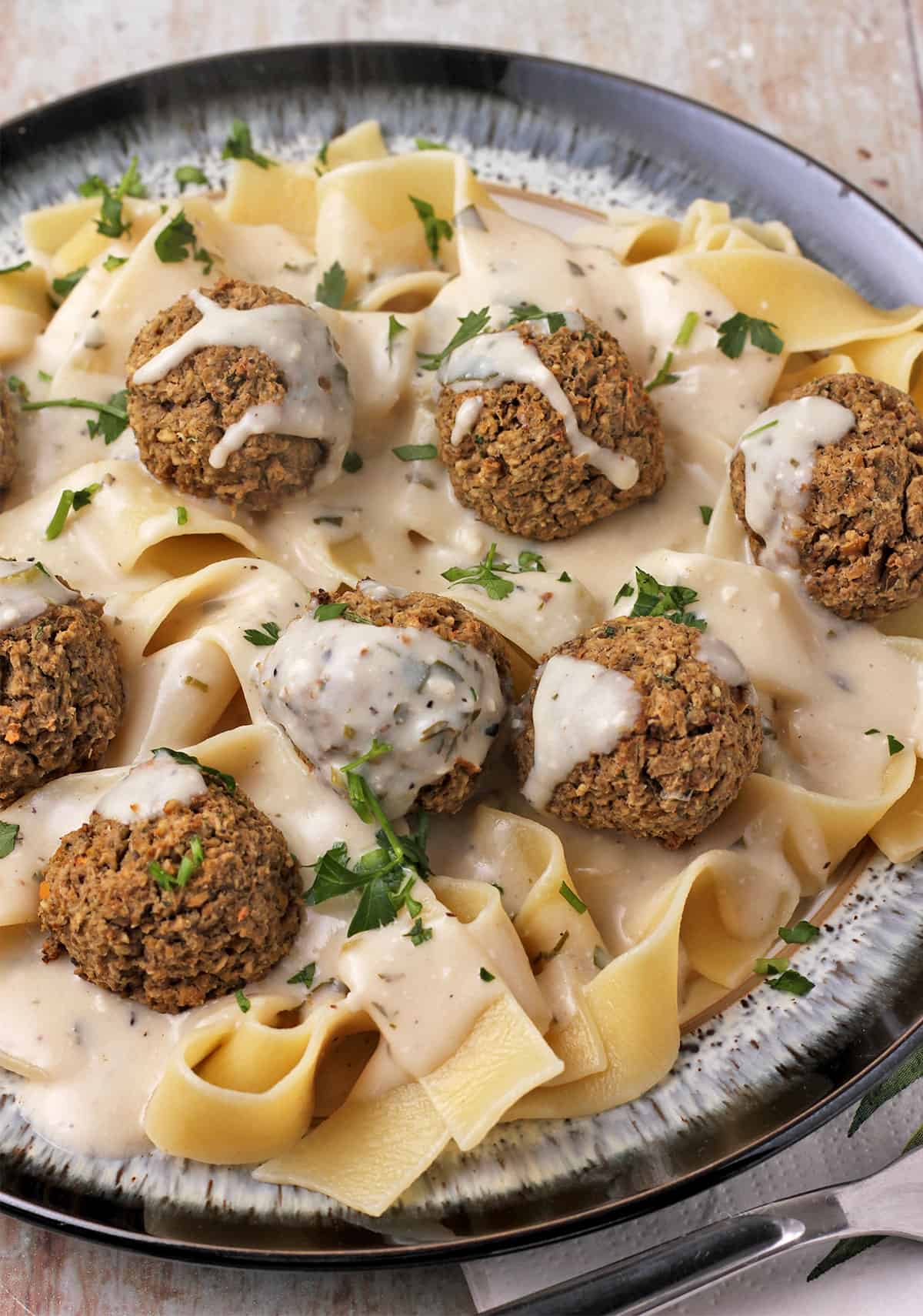Serve your perfect veggie Swedish meatballs and creamy gravy over your favorite pasta or noodles. I used wide semolina wheat pappardelle, but often I use vegan fettuccine or tagliatelle. And since it's gravy, mashed potatoes make the ultimate comfort meal.